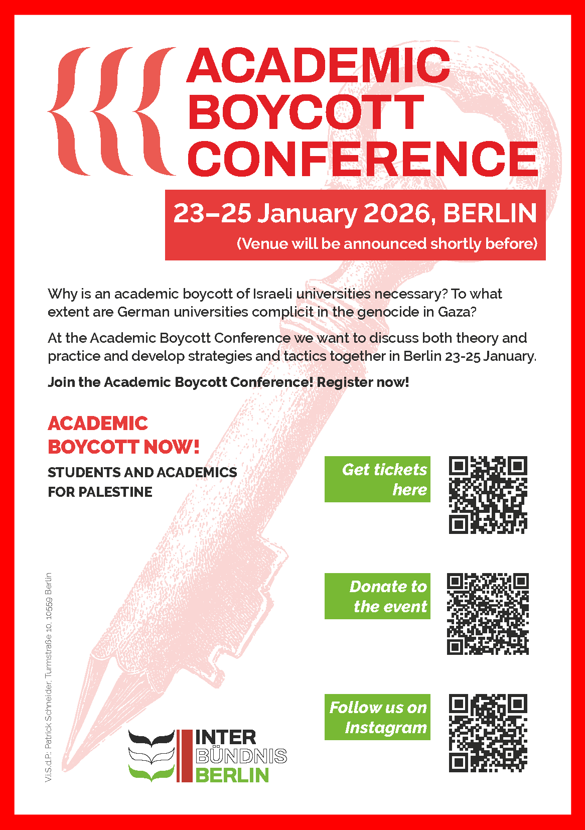 Our goal remains the comprehensive termination of institutional collaboration for as long as the Palestinian people are oppressed. Through our work, we aim to provide an impetus to unify local approaches of student and academic campaigns for an academic boycott across Germany.